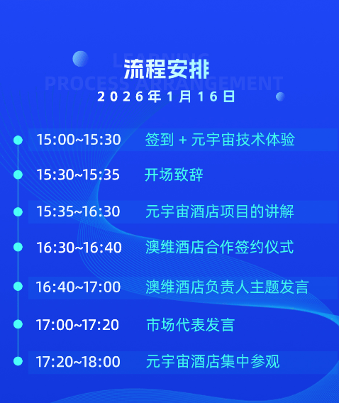 ·概览:以从现实体验踏入虚拟奇境为始,通过深度解读、战略签约,引领嘉宾亲身沉浸于未来酒店的虚实共生场景之中,完整呈现一场融合理念、实践与体验的元宇宙旅居开创之旅。