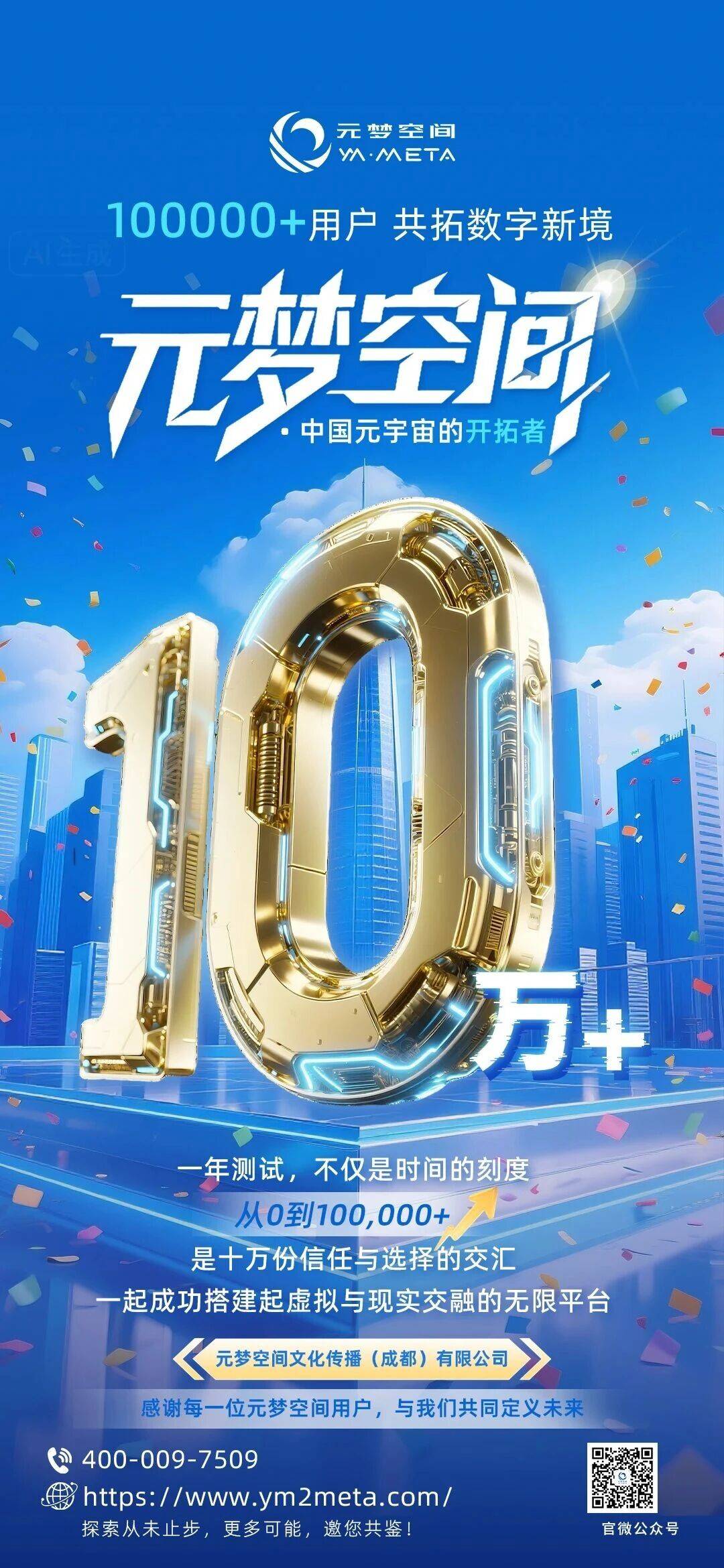 在元宇宙赛道的探索征程中,元梦空间始终以“中国元宇宙开拓者”的姿态,锚定“虚拟与现实交融”的无限可能。当用户突破100000+里程碑,这场“从0到十万”的跨越,不仅是数字刻度的跃迁,更是十万份信任与选择的交汇,更是技术沉淀、生态构建与用户共情的深度共振。